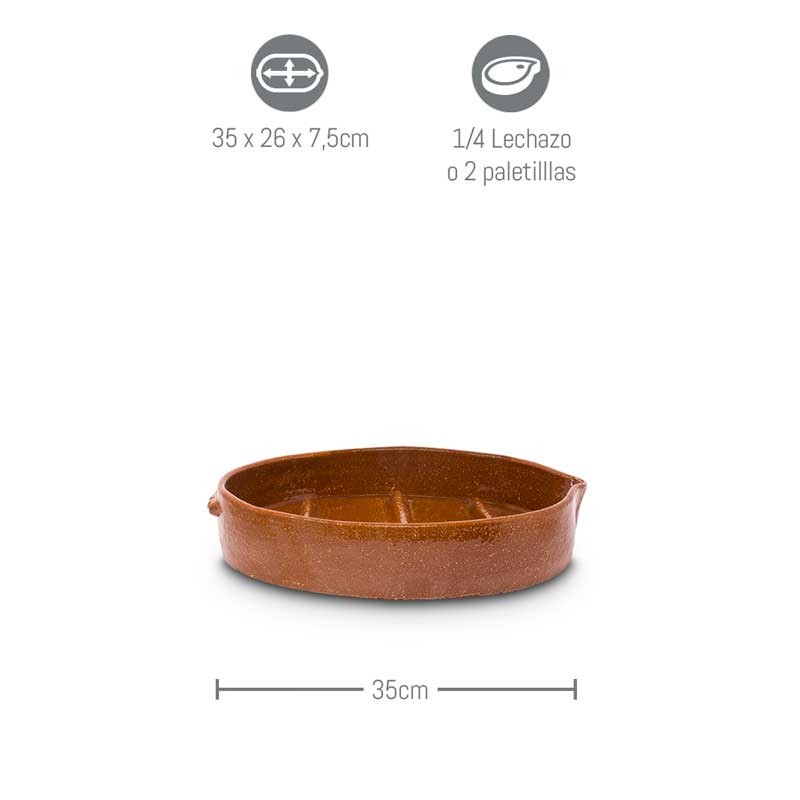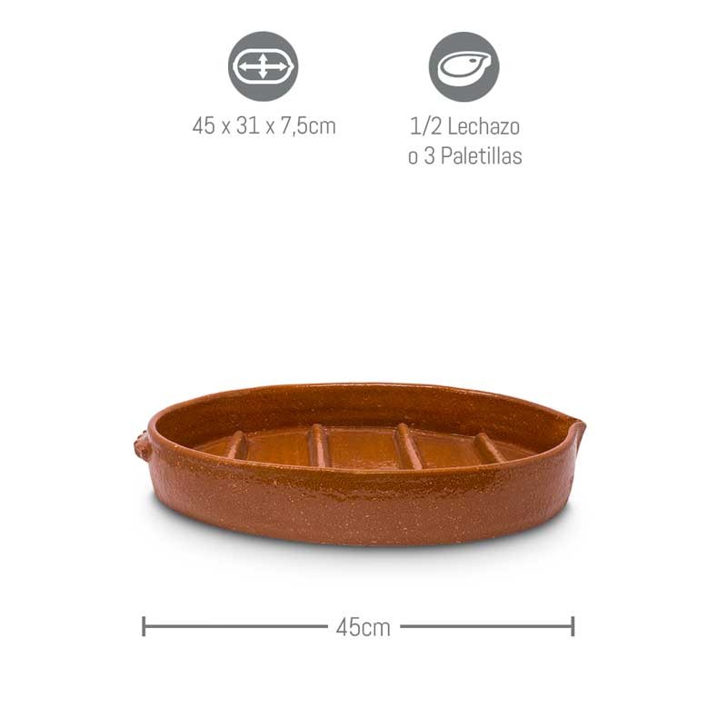 45 x 31 x 7,5 cm. Capacidad 3 paletillas de lechazo o 1/2 lechazo