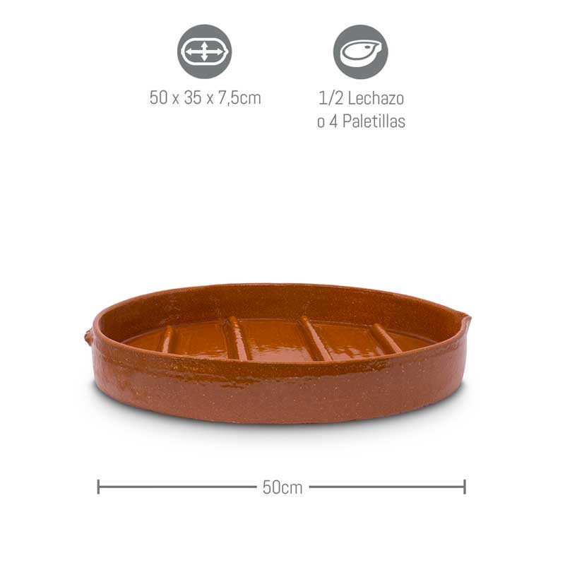 50 x 35 x 7,5 cm. Capacidad 1/2 lechazo o dos cuartos, 4 paletillas
