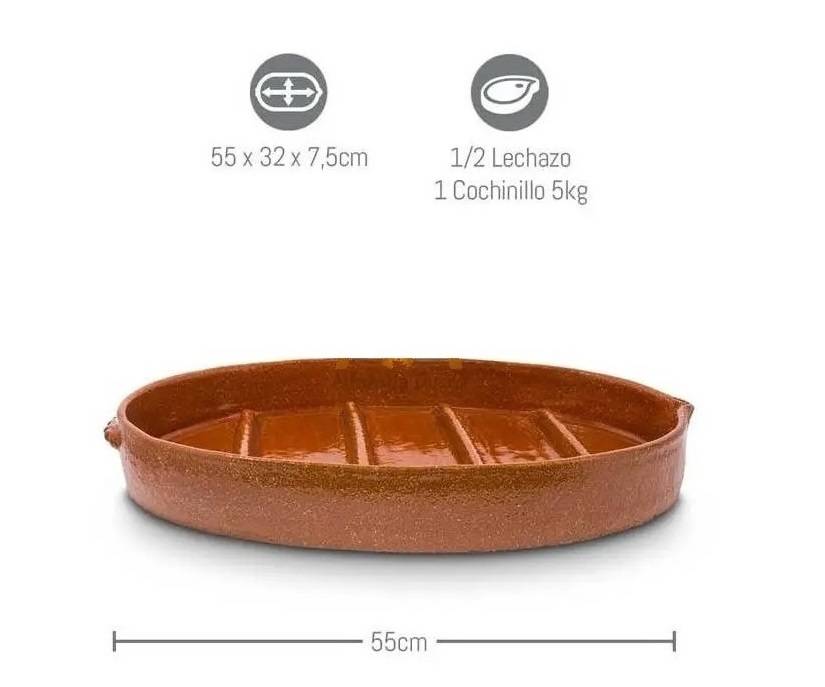 55 x 32 7,5 cm. Capacidad 1/2 lechazo o dos cuartos o 1 cochinillo de 5 kg.
