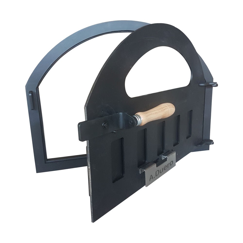 Puerta metálica de Arco de Medio Punto para hornos de leña de cualquier tipo (barro, ladrillo, piedra, hormigón, hierro, etc), también se puede utilizar para hornos morunos con bocas cuadradas, restauraciones de hornos adaptando nuestro diseño al tamaño real.